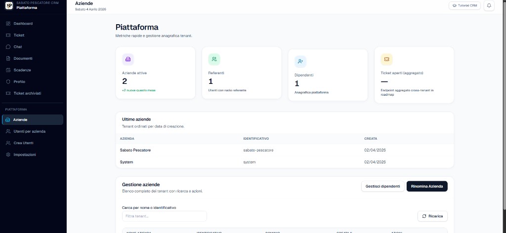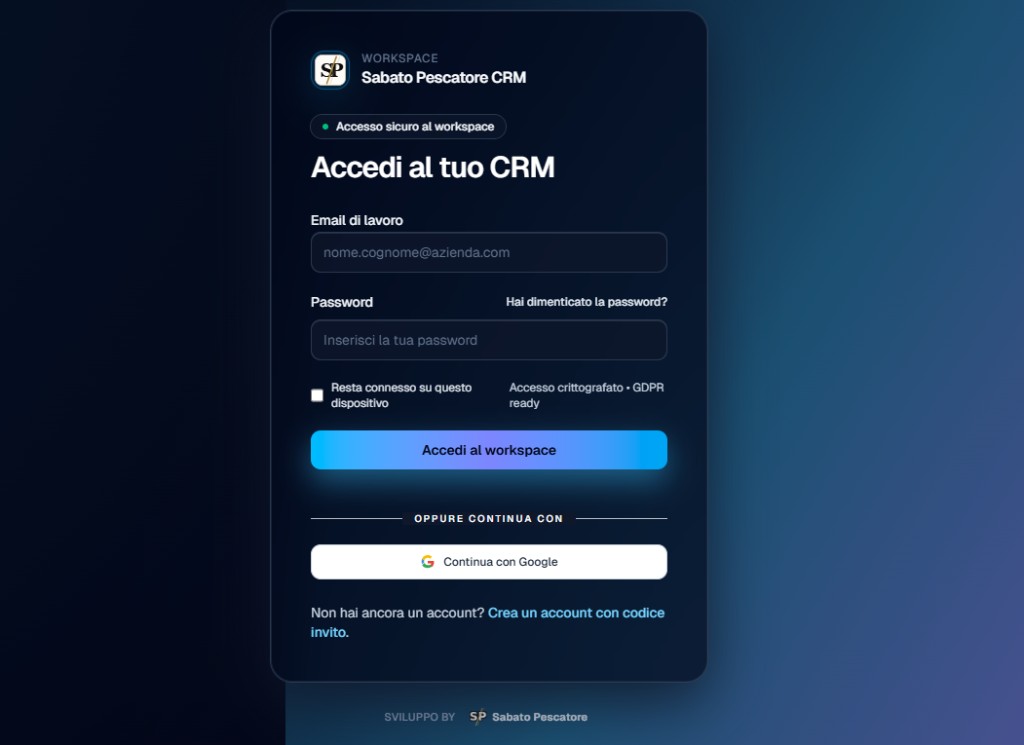 Per provare il CRM collegati a https://crm.sabatopescatore.it/: l’accesso è protetto, quindi scrivimi per le credenziali di prova e ti abilito un account (anche con dati di esempio o un percorso vicino al tuo caso).